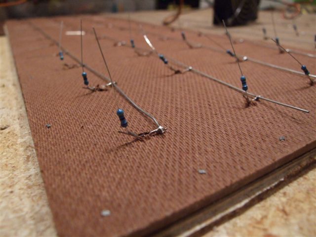 En utilisant la technique du multiplexage, il faut mettre un transistor par rangée et un transistor par colonne pour que l'on puisse donner plus d'intensité aux LEDs. Sans utilisation de transistors le microcontrôleur va griller car les LEDs demandent beaucoup trop de courant. Au total, nous devons disposer de 24 transistors : 12 transistors 2N3904 de type NPN et 12 transistors 2N3906 de type PNP. À chacune des LEDs j'ai connecté une résistance de 68 Ohms. Ensuite, j'ai connecté tous les positifs d'une même colonne entre eux et j’ai répété cela pour les 12 colonnes. J'ai connecté tous les négatifs d'une même rangée ensemble et répété cela pour les 12 rangées. Au final je dispose de 12 entrées et 12 sorties qui vont me permettre de contrôler le reste du circuit.