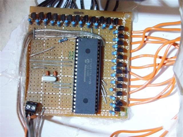 L’ensemble est géré par un PIC16F877A, car il offre de nombreuses broches d’entrées/sorties (I/O) et dispose d’une très grande mémoire pour enregistrer les codes de programmation. Il est connecté à un oscillateur (crystal) de 4 MHz et de 2 condensateurs de 22 pF. À la sortie des broches (I/O pins), il faut disposer les résistances de 1K Ohm pour contrôler individuellement chaque transistor et protéger le PIC.